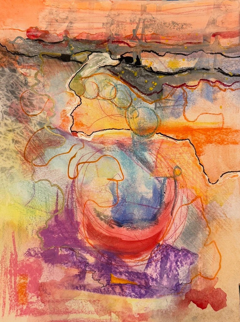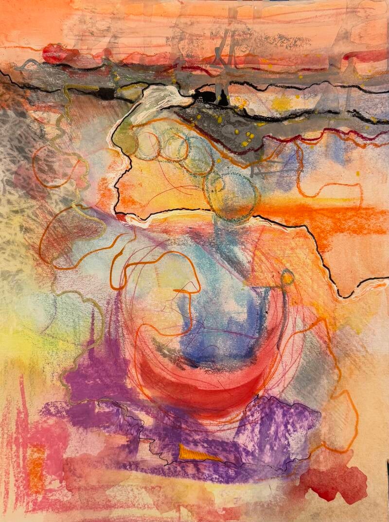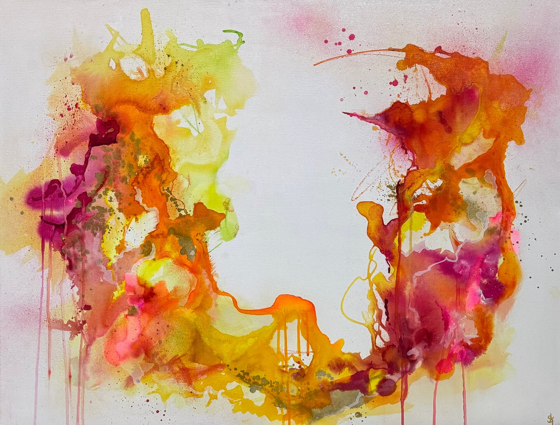 In dit werk heb ik diverse soorten inkt gebruikt en in elkaar laten vloeien. Door samenspel van warme tinten -rijke oranjes, zachtroze, fuchsia en zonnige geeltinten - straalt het levendige energie uit. De heldere kleuren voelen als een nieuw begin. De ronde vorm staat voor herhaling en geborgenheid.