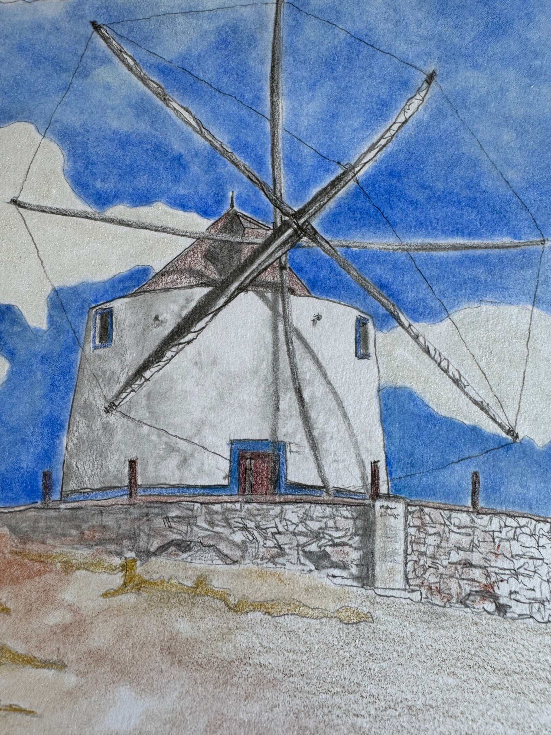 Aljustrel has several historic sites. The mill dates back to the fourteenth century. Its white cloth sails are wrapped around the blades. In the past, seventeen mills stood around Aljustrel; this is the only one that has been preserved. Many former mills in Portugal have been demolished or converted into homes. According to the information I found online, the hill on which the moinho stands offers wide views over the surrounding landscape. That view is something I hope to go and see for myself soon.